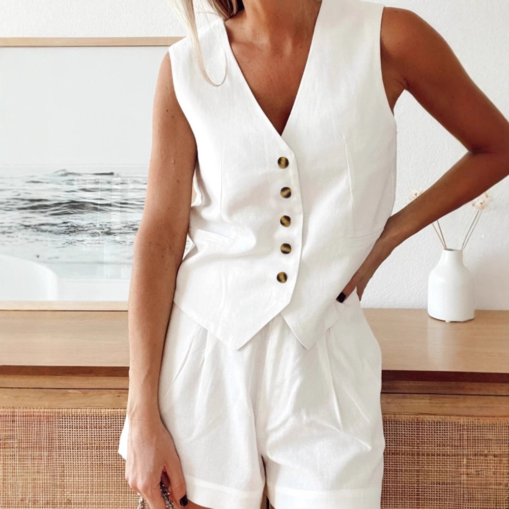 White Lapel Collar Cuff Stripe Splicing Casual Suit Set with Sleeveless Vest and Shorts Three-Piece Set